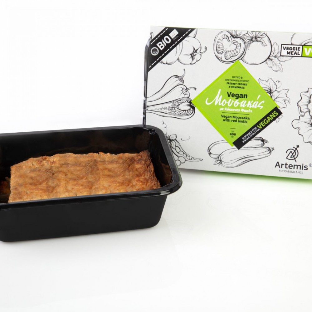 Vegan μουσακάς με σάλτσα από κόκκινες φακές Aretemis 400gr