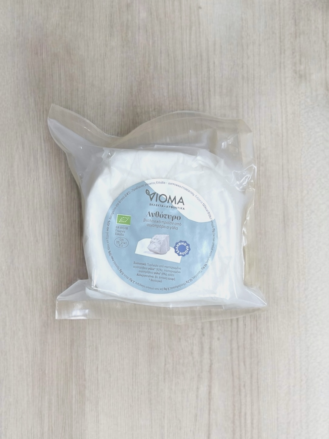 Το Vioma Ανθότυρο είναι ένα αυθεντικό, βιολογικό ελληνικό τυρί, παρασκευασμένο από τυρόγαλο και παστεριωμένο αιγοπρόβειο γάλα. Με ελαφριά, δροσερή γεύση και μαλακή υφή, αποτελεί ιδανική επιλογή για σαλάτες, πίτες ή και μόνο του ως σνακ.