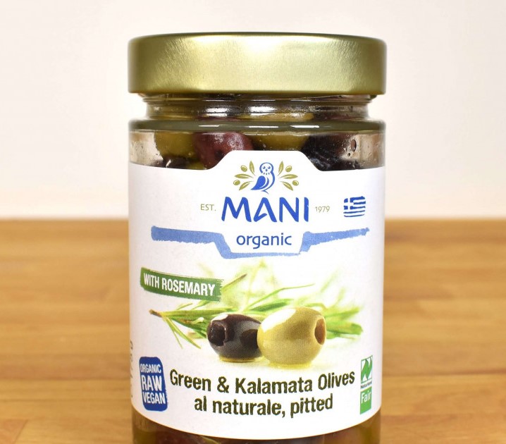 Ένας τέλειος συνδυασμός φρουτώδους γεύσης, ελιών Καλαμάτας με πιστοποίηση Naturland Fair και γευστικών, βιολογικών ελιών Κονσερβόλια. Διαλεγμένες με το χέρι από Έλληνες αγρότες και απομακρυνθείσα η πικρή γεύση τους με φυσικό τρόπο, αυτές οι ελιές μαρινάρονται σε εκλεκτό βιολογικό ελαιόλαδο MANI με δεντρολίβανο και μια πινελιά ξύδι από κρασί. Συσκευασμένες σε κενό αέρος για απόλυτη φρεσκάδα και ποιότητα ωμού τροφίμου.