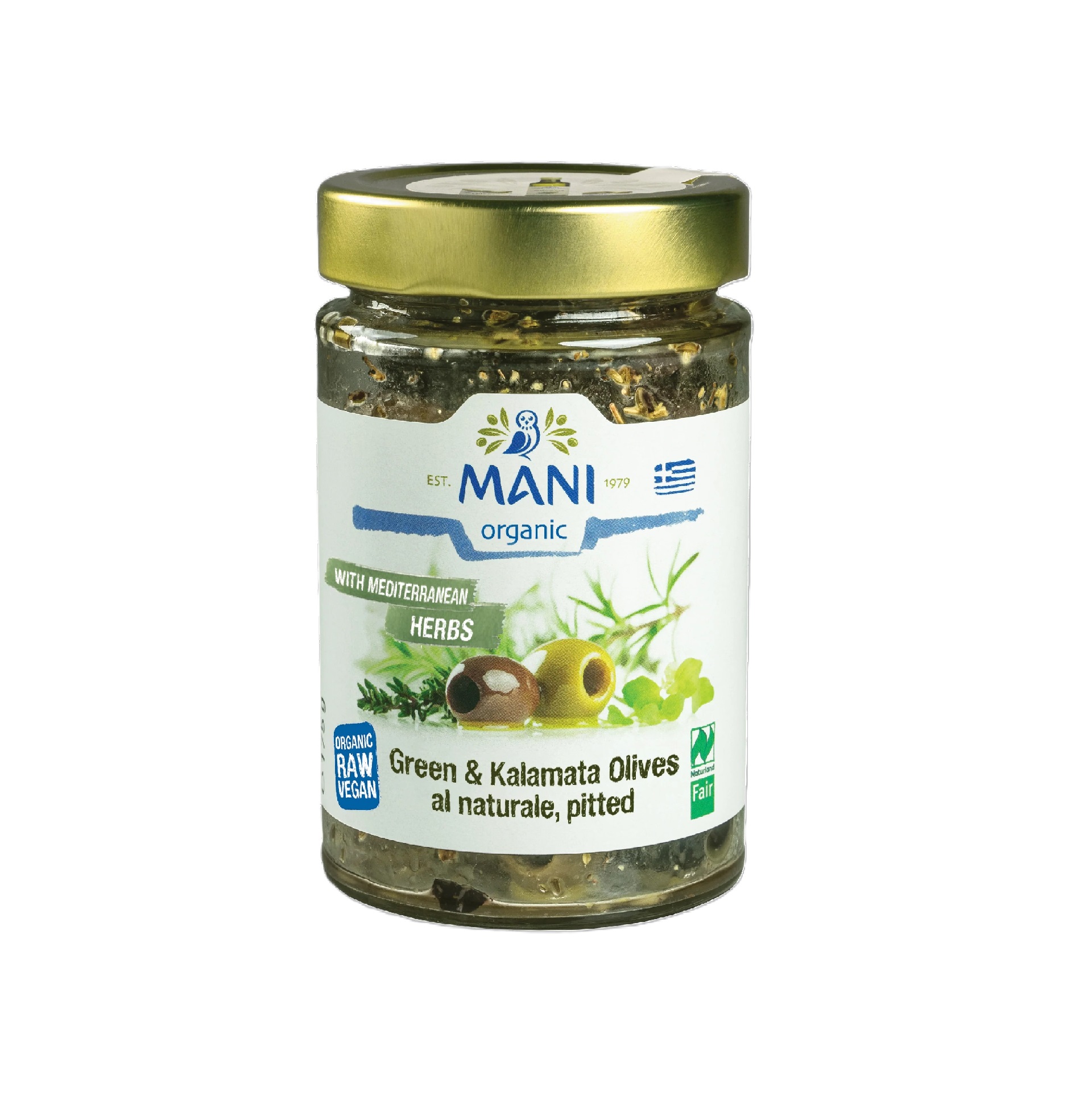 Ένα γευστικό μείγμα από φρουτώδεις ελιές Καλαμάτας και πικάντικες ελιές Κονσερβόλια, και οι δύο πιστοποιημένες βιολογικές και Naturland Fair. Διαλεγμένες με το χέρι από Έλληνες αγρότες και αποπικραμένες με φυσικό τρόπο, αυτές οι ελιές μαρινάρονται σε εκλεκτό βιολογικό ελαιόλαδο MANI, ρίγανη, θυμάρι και δεντρολίβανο, με μια πινελιά ξύδι από κρασί για μια ισορροπημένη γεύση. Συσκευασμένες σε κενό αέρος για φρεσκάδα και ποιότητα ωμού τροφίμου.
