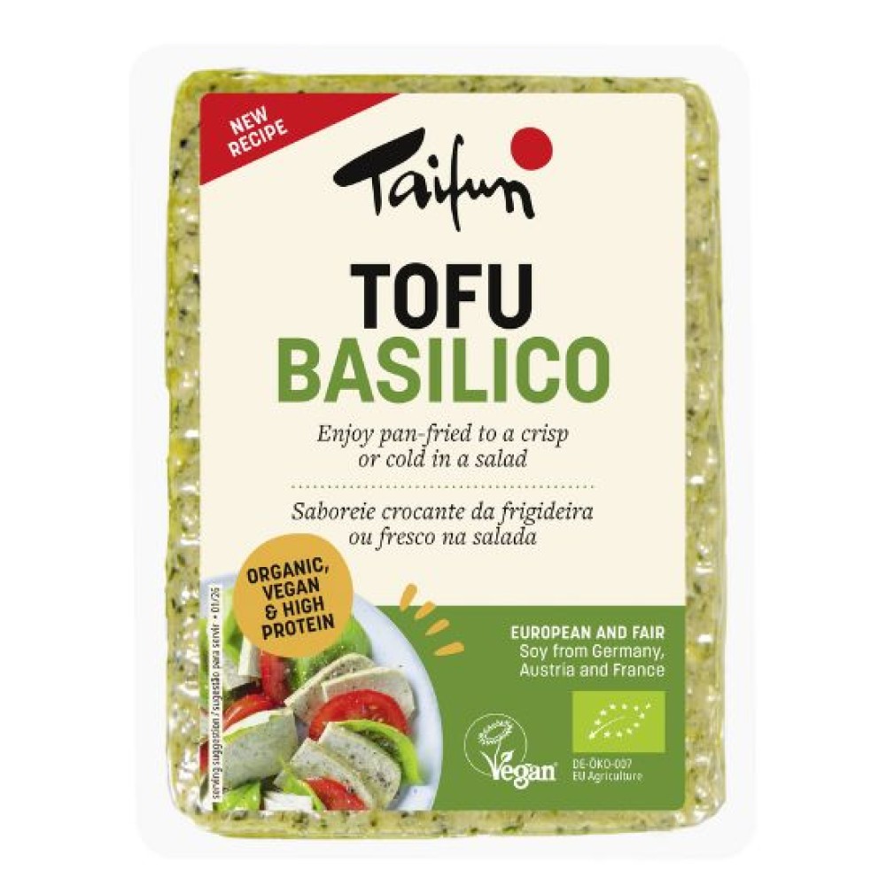 Τόφου Βασιλικός 200γρ Συστατικά: Τόφου*90% (νερό, φασόλια σόγιας*, πηκτικό μέσον: νιγκάρι [χλωριούχο μαγνήσιο], θειικό ασβέστιο), έξτρα παρθένο ελαιόλαδο*, βασιλικός*3,2%, ζωμός λαχανικών*(θαλασσ.αλάτι, εκχύλισμα μαγιάς, άμυλο πατάτας*, πράσο*, καρότα*, ηλιέλαιο*, μοσχοκάρυδο*, μαϊντανός*, σέλινο*), άγριο σκόρδο*, μαϊντανός*. *Προϊόν Βιολογικής Γεωργίας