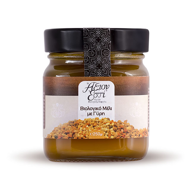 Το βιολογικό Μέλι με Γύρη Άξιον Εστί, είναι ένας συνδυασμός βιολο-γικού μελιού ανθέων και δάσους και φρέσκιας βιολογικής γύρης των μελισσών μας. Αποτελεί μια υπερ-τροφή, η οποία συγκεντρώνει τις ευεργετικές ιδιότητες του μελιού και της γύρης σε ένα προϊόν υψη-λής διατροφικής αξίας, με βελού-δινη κρεμώδη υφή και πλούσια μοναδική γεύση. Η κατανάλωση της πρέπει να είναι σταδιακή.