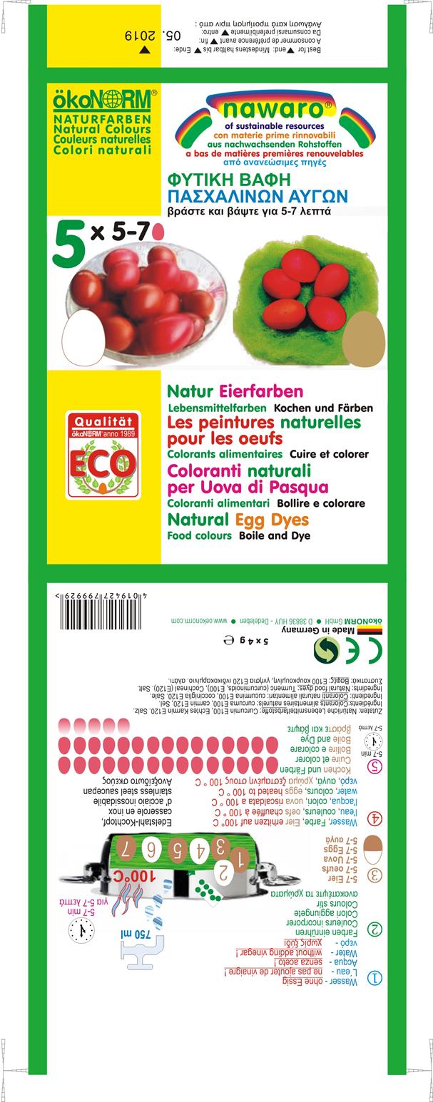Οι χημικές βαφές οι οποίες πολλές φορές περνάνε και ποτίζουν το αυγό, είναι επικίνδυνες για τον ανθρώπινο οργανισμό. Προτείνουμε τις φυτικές βαφές Πασχαλινών αυγών Okonorm, οι οποίες έχουν δημιουργηθεί από φυσικές πρώτες ύλες, ακίνδυνες για τον άνθρωπο. Περιέχουν κουρκουμίνη, χλωροφυλίνη, καρμίνη, αλάτι, ζάχαρη, μαλτοδεξτρίνη και άμυλο. Δεν έχετε παρά να τις δοκιμάσετε σε 2 διαφορετικές συσκευασίες, μία σε κόκκινο χρώμα και μια σε 5 χρώματα: κόκκινο, κίτρινο, πράσινο, πορτοκαλί, ροζ.