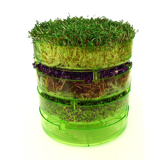 To Geo Sprouter είναι ο ευκολότερος και γρηγορότερος τρόπος για να καλλιεργήσετε φύτρα στο σπίτι. Έχει σχεδιαστεί για να μεγαλώνει κάθε είδους σπόρους από πολύ μικρούς όπως άλφαλφα μέχρι κολλώδεις όπως κάρδαμο. Το πακέτο περιέχει 3 δισκάκια με διάμετρο Ø 20cm, 1 δισκάκι ειδικά σχεδιασμένο για να επιτρέπει την εύκολη απορροή νερού, 4 διαχωριστές που κρατούν τα δισκάκια σε σταθερή θέση και αυξάνουν την απόσταση των επιπέδων για καλύτερη κυκλοφορία αέρα. Οι οδηγίες χρήσης που περιέχονται στο κουτί είναι φιλικές προς το χρήστη και ισχύουν γενικά για όλα τα είδη σπόρων. Αυτό που διαφέρει ανάλογα με την ποικιλία του σπόρου είναι η απαιτούμενη ποσότητα και ο απαιτούμενος χρόνος βλάστησης / συγκομιδής τους.